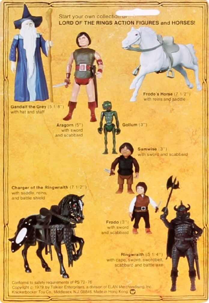 The first Tolkien Action Figures came with the Bakshi Lord of the Rings Animated Film in 1978 and were produced by Knickerboker. This was a limited of just 6 figures and 2 horses, all carded. These have now become very collectable, particularly in mint packaging. https://vintageactionfigures.com/the-lord-of-the-rings-knickerbocker.html, https://youtu.be/uGQn-F5xnng.